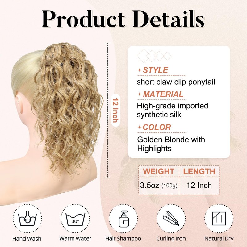 FLUFYMOOZ Ponytail Extension, 12" Short Claw Ponytail Extension Wavy Curly Jaw Clip in Pony tails Hair Extension Natural Synthetic Hairpiece for Women (Golden Blonde with Highlights)