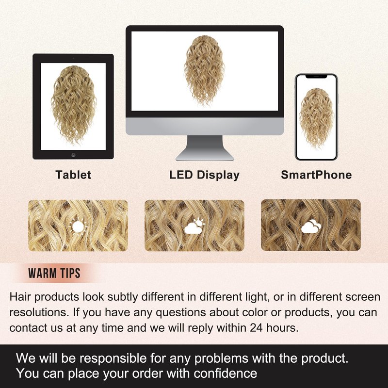 Due to the screen resolution settings, you may see some slight differences between the color tone of the ponytail extension in the photos and the claw clip ponytail extension, and Hair color can also vary slightly, this is a normal phenomenon.