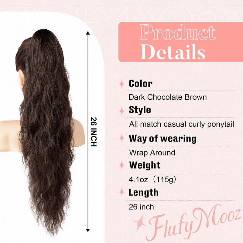 FLUFYMOOZ Ponytail Extension, Flexible Wrap Around Ponytail Extension Long Wavy Curly Ponytail Hair Extensions Natural pony tail Synthetic Hairpiece for Women 26 Inch (Dark Chocolate Brown)