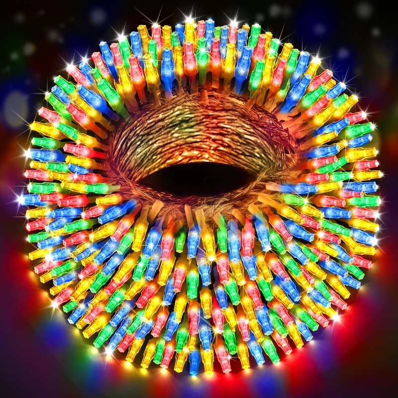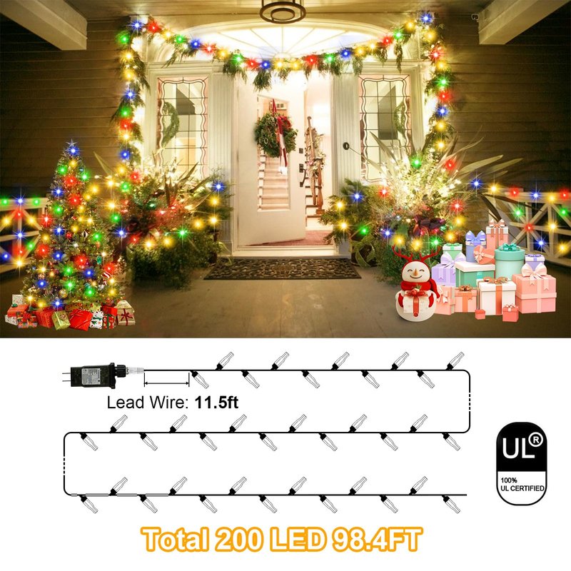 - 【Upgraded F8 200 LED Outdoor Christmas String Lights】 Total length: 98 feet. Outdoor Christmas lights have 200 LEDs, the remaining 3.5 meters/11.5 feet are extra long leads - ideal if your outlets are not nearby, able to connect to various places for power to facilitate your decorations. One set of our Christmas lights is all you need for large indoor and outdoor decorations.