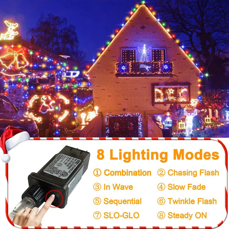 - 【8 Light Modes Christmas Lights Decorations】Our Christmas light string has 8 modes for you to choose from (1. Combination, 2. In waves, 3. Sequential, 4. Slo-glo, 5. Chasing/flash, 6. Slow fade, 7. Twinkle/flash, 8. Steady on) Suitable for various occasions to show different Christmas holiday atmosphere.
