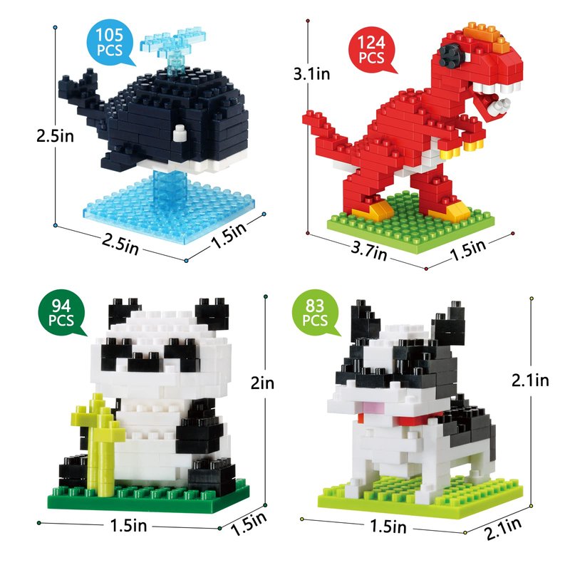 【4 PACKS】These mini building blocks are animals of different designs for Panda, Bulldogs, whales, and dragons building blocks to meet your kid's car dream! Engineered Specifically for over 3 years old kid.