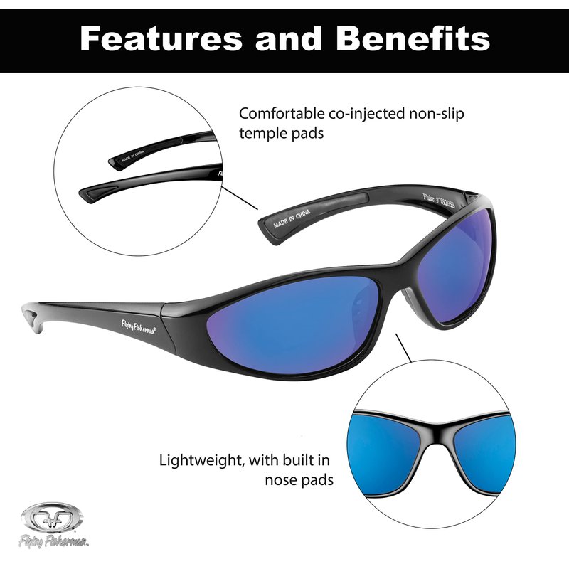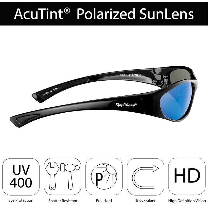 - FLUKE JR, BLACK FRAMES/BLUE MIRROR SMOKE LENS. Flying Fisherman Action Angler Sunglasses with polarized triacetate lenses improve visibility for any activity. They are scratch resistant, lightweight and durable so you can take them everywhere