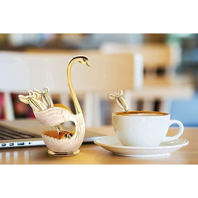 Flylin Coffee Dessert Spoon Set Metal Swan Base Holder Spoon Organizer with 6pcs Ice Cream Spoons Teaspoons Coffee Dessert Flatware (Gold)