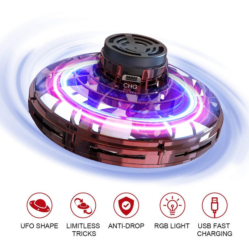 - 【Safe and Anti-drop】: This light up UFO drone toy made of high-quality non-toxic and soft ABS material, and the closed wheel design will effectively protect hands when spinning, keeps the drone safe from damages.It will stop automatically when it hit the furniture or any other stuffs.
