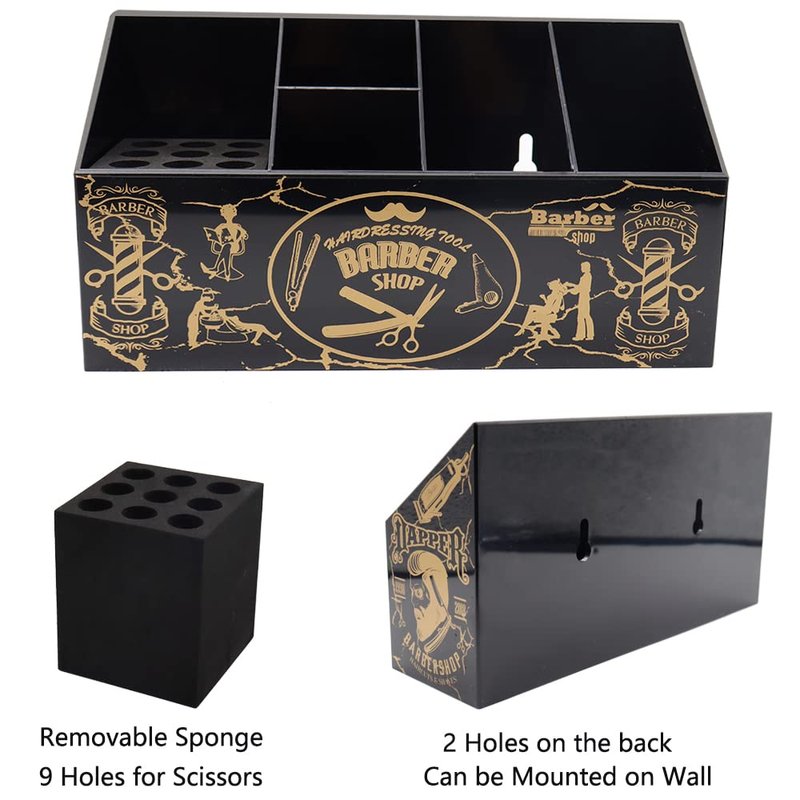 - Space Saving & Wall Mounted: This barber supply tool organizer has 5 compartments of different sizes and a detachable sponge liner with holes for special shears scissors storage. This barber organizer rack has two holes on the back, which can be wall mounted. Size: 10.6 x 3.15 x 5.5”(L x W x H). It’s handy to keep out but big storage.