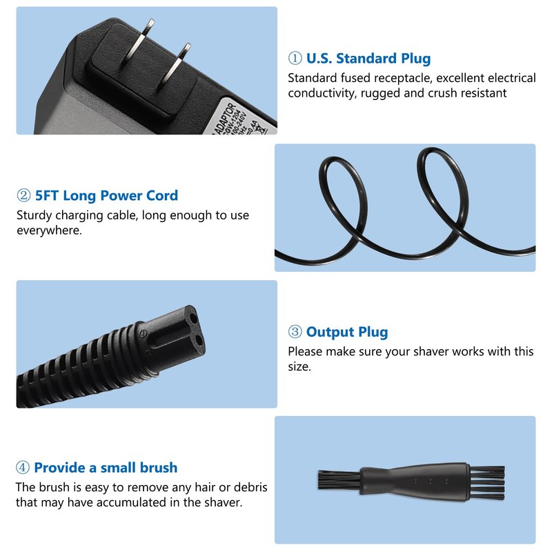 - 🔌【Product Specification】Input: AC 100–240V 50/60Hz, Output: DC 12V 0.4A; Cable length: 5ft/1.5m. This Shaver charger is specifically designed for Braun shaver, providing ample cable length for flexible indoor use.
