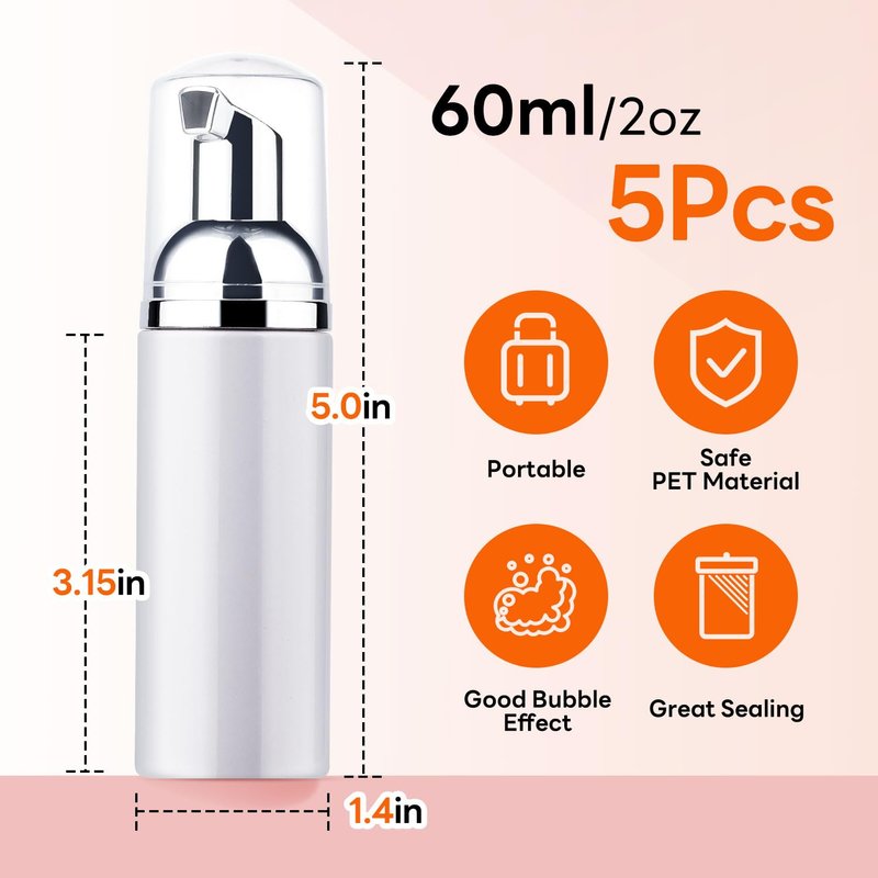 Foam Pump Bottle 60ml Lash Soap Dispenser Bottle Travel 5Pcs Empty Plasitc Refillable Mini Bottle for Hand Soap Shampoo Lash Cleanser Foam Bottle