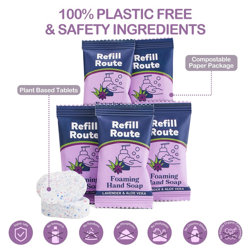 - EMBRACE A MORE SUSTAINABLE FUTURE: Refill Route foaming hand soap tablets are packaged in compostable paper and no plastic. And they are easy to carry, making them perfect for home, travel, camping and more. The tablets are not compatible with normal dispensers but with all foam dispensers.