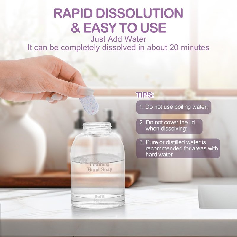 - ENJOY THE PLEASANT SCENT OF LAVENDER: Refill Route foaming hand soap tablet is formulated with mild, skin friendly ingredients, it leaves your hands feeling soft and moisturized. Please apply the foam evenly to your hands before washing off with water.