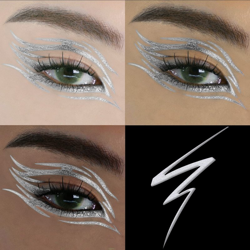 1. The eyeliner appears to change to 2-3 colors when viewed from different angles depending on the lighting. Use pigmented liquid liner’s fine brush tip to shape the eye with a saturated and metallic finish.