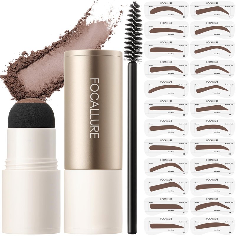 FOCALLURE Eyebrow Stamp and Eyebrow Stencil Kit, 24 Reusable Brow Shape, Sweatproof Eyebrow Powder, Long-Lasting, Easy to Use, Filling and Shaping Perfect Eyebrow Makeup, LIGHT BROWN