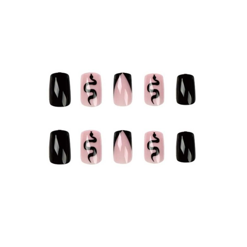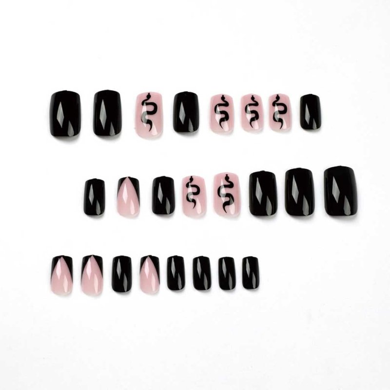 Foccna Black Square Press on Nails Snake Women's French False/Fake Nails Tips Medium Glossy Daily Wear Artificail Nails for Nail Art Manicure Decoration
