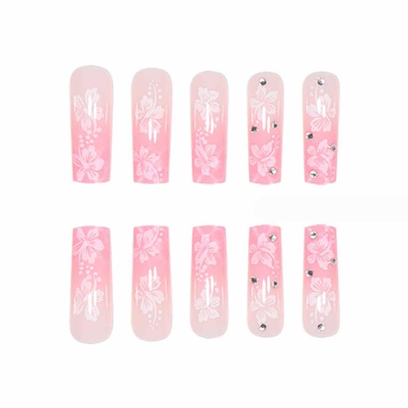 Foccna Pink Press on Nails Long,Flower Fake Nails Square Bling Glossy Rhinestone False Nail Tips Artificial Nails for Women and Girls-24pcs