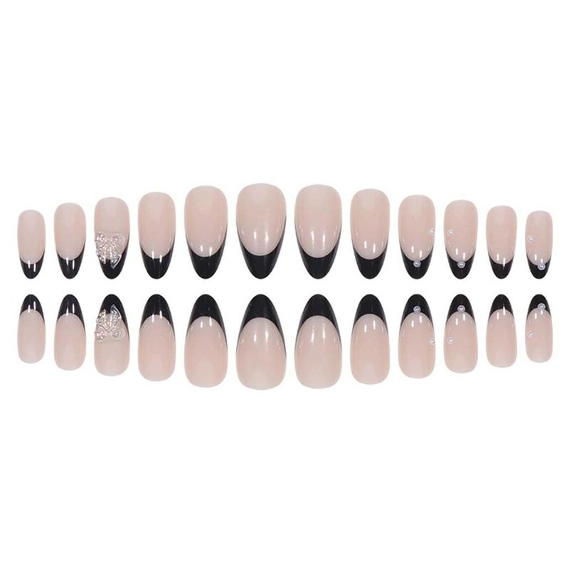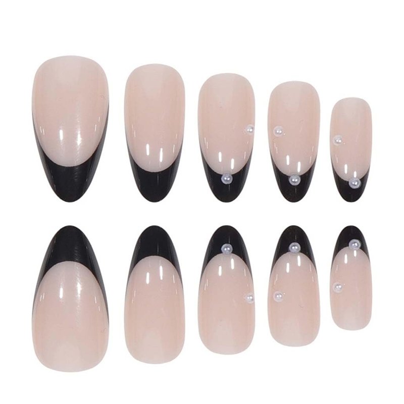 Foccna Press on Nails Medium Pearl Black Fake Nails Almond Glossy 3D False Nail Tips French Artificial Nails Finger Manicure for Women and Girls,24pcs
