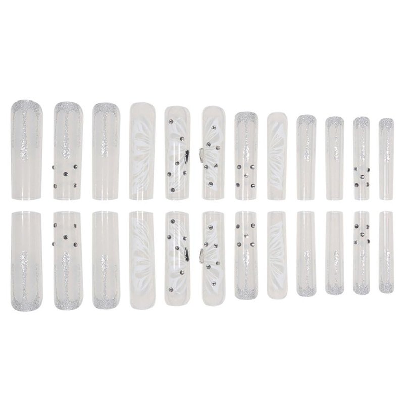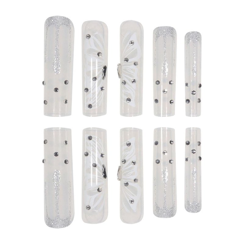 Foccna Press on Nails Super Long Rhinestone White Fake Nails Square Bling Glossy Butterfly False Nail Tips Artificial Nails Finger Manicure for Women and Girls-24pcs