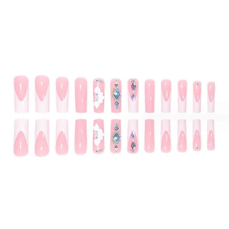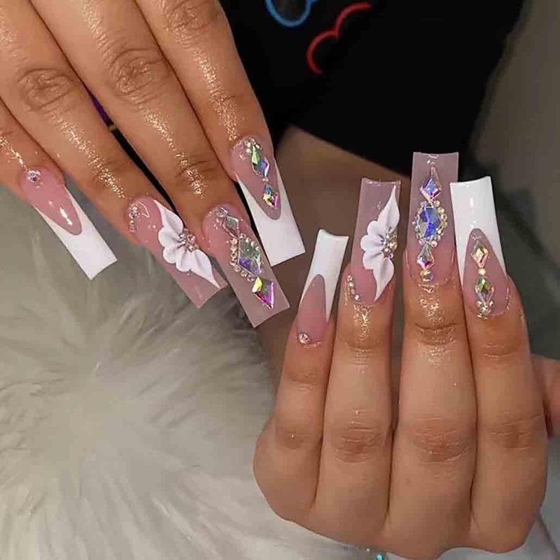 Foccna White Press on Nails Artificail Extra Long, French Square Fake Nails, Crystal Flowers Nails Acrylic Full Cover Long Fake Nails with Design Nail Tips for Women&Girls-24PCS