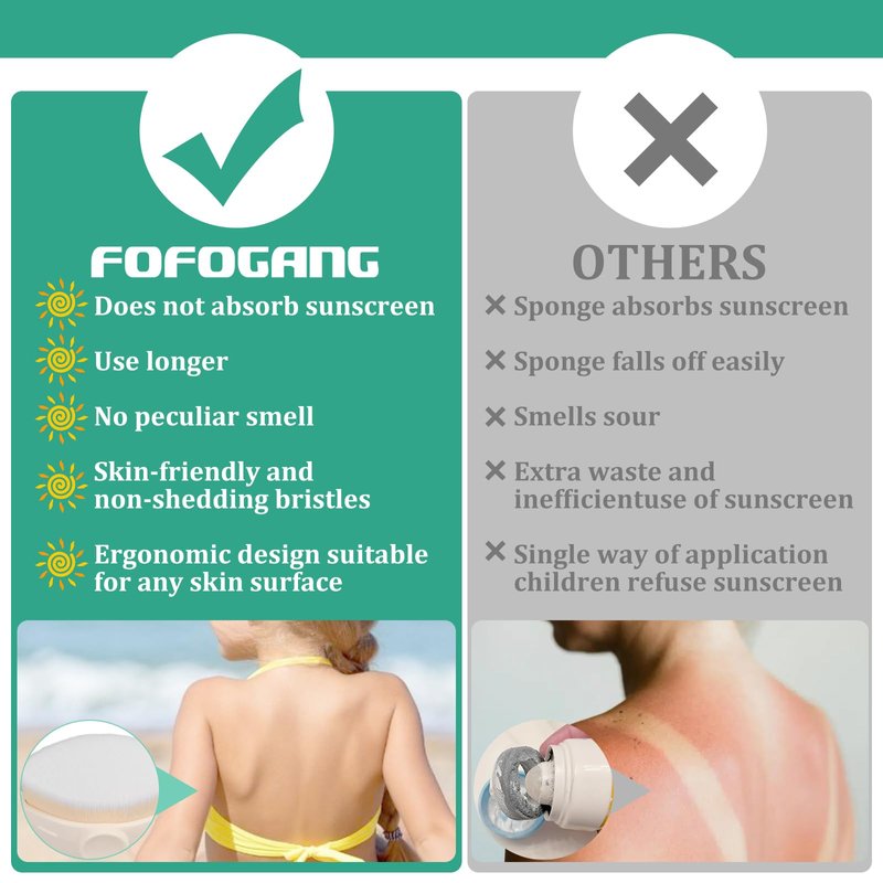 - Traditional sunscreen roller applicators have sponges that absorb a lot of sunscreen, make it impossible to control the amount, are difficult to clean and cause the sponge to develop a sour odour. Compared to it, our kids sunscreen brush applies more evenly, does not absorb too much sunscreen, can control the amount and avoid sticky hands.
