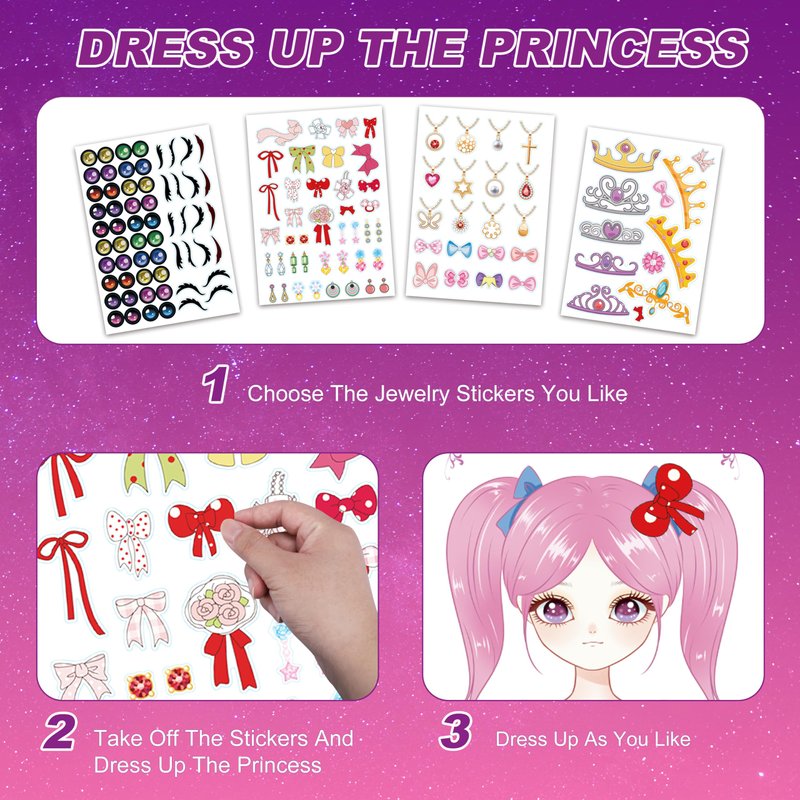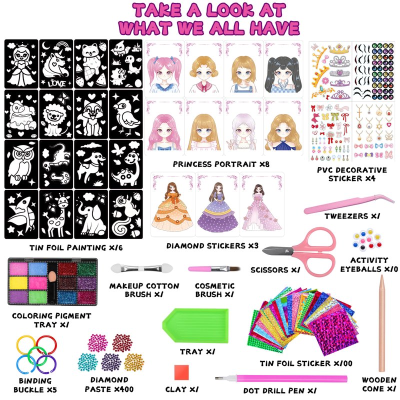 - Multi-functional Foil Art Kit: This kit allows children to use many decorative stickers to create beautiful make-up for the princess on the princess portrait, and then use decorative diamonds to decorate the princess's gorgeous dress. Children can also stick foil sheets on the painting as they like. The finished princess portrait and foil painting can be combined into a picture album with binding buckles, which is convenient for storage and carrying, parents don't need to worry about the mess