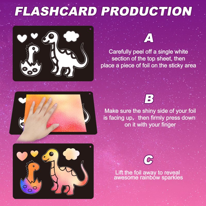 - Easy to Use: Choose a foil card, use the sparkly foil sheets to cover the sticky parts, then press firmly. Children can use various colorful foil sheets and decorations, give full play to kids' creativity and make it to bring them to the foil fun picture life