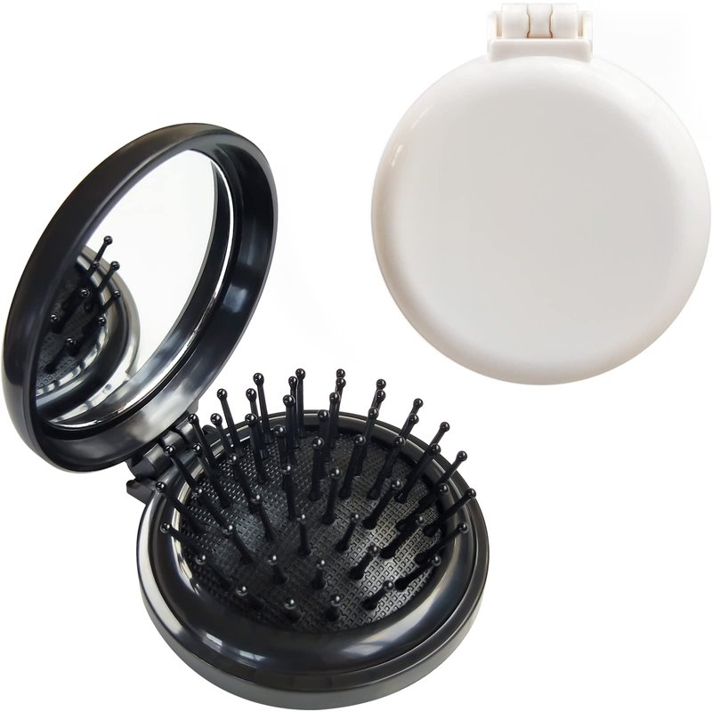 Folding Hair Brush with Mirror for Purse/Pocket,Round Mini Compact Massage Comb for Girls and Women (Black+White)