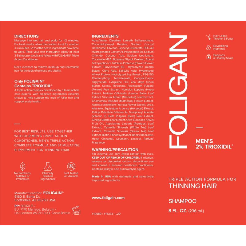 - Triple Action Shampoo: Foligain’s volumizing shampoo contains Trioxidil, a triple action hair health complex with bioactive ingredients, & natural botanicals. This method includes moisture-lock technology & targeted nutrients. 100% Drug Free formula.