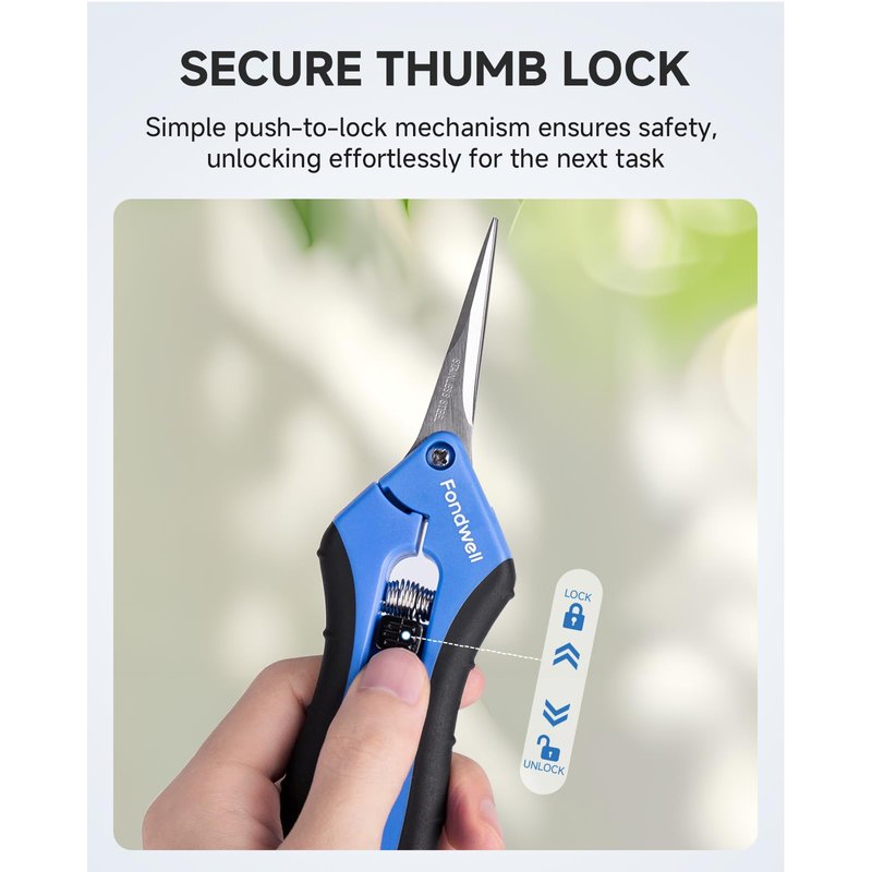 Discover the ultimate tool for your gardening needs with our 6.5-inch pruning shears - designed for precision and comfort. These gardening scissors are engineered with an ergonomic design that ensures clean, precise cuts while reducing hand fatigue, allowing you to prune, trim, and shape effortlessly. Crafted from premium materials, these pruning scissors feature durable, rust-resistant stainless steel blades that promise long-lasting sharpness. The high-quality PP handles and comfortable TPR grips offer a secure, non-slip hold, ensuring strength and longevity, even with extended use. Whether you're trimming small plants, shaping bonsai trees, or harvesting fruits, these trimming scissors deliver outstanding performance. Safety is a priority, and these trimming shears come equipped with a simple push-to-lock mechanism, keeping the blades securely closed when not in use. This feature adds convenience, making these gardening shears easy to store and carry. Built to last, our garden shears are designed with a sturdy spring action that smoothly resets the blades after each cut, enhancing efficiency. Versatile and reliable, these pruners are the perfect companion for every gardener, offering unmatched precision with every snip. Elevate your gardening experience with our garden scissors today.