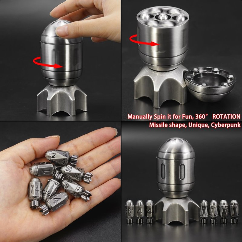 - SOLID METAL CONSTRUCTION: The spinning missile container is made of solid metal with three parts: lid, cylinder, and base. Both body and base can be rotated manually. The smooth spinning action providing an engaging experience for relaxation or game play