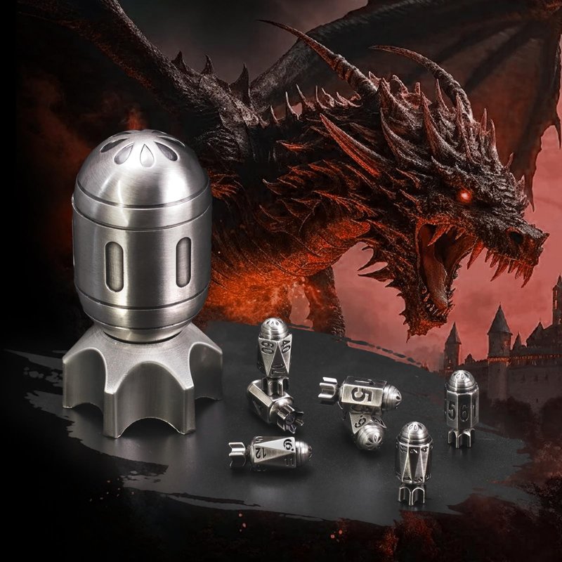 FONVGOGO Missile Metal DND Dice Set of 7 with Spinning Missile Shaped Container, Cyberpunk Unique Cool Bullet D&D Dice for Dungeons and Dragons Sci-Fi Warhammer 40K War Crime Theme Games (Sliver)