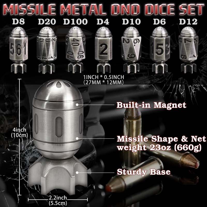 - COOL MISSILE-SHAPED DESIGN: The dice set is themed "missile" with a unique and cool shaped design, a must-have for a gunslinger character, including 7 missile dice and container, they weigh about 23 oz (650 g) and much heavier than others on the market
