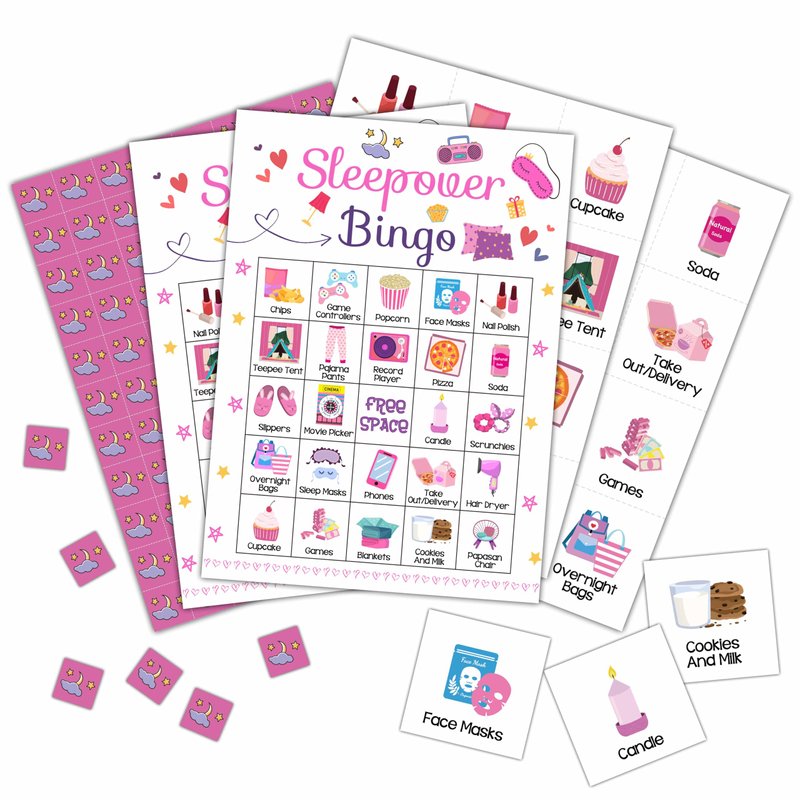 - 【ENJOY SLEEPOVER BINGO CARDS】The Sleepover bingo game is an easy party activity to play and the cards are full of chips, cupcake, popcorn, sleep masks, slippers, game controllers and more, which will add warm ambience. Absolutely an awesome wedding gift for you!