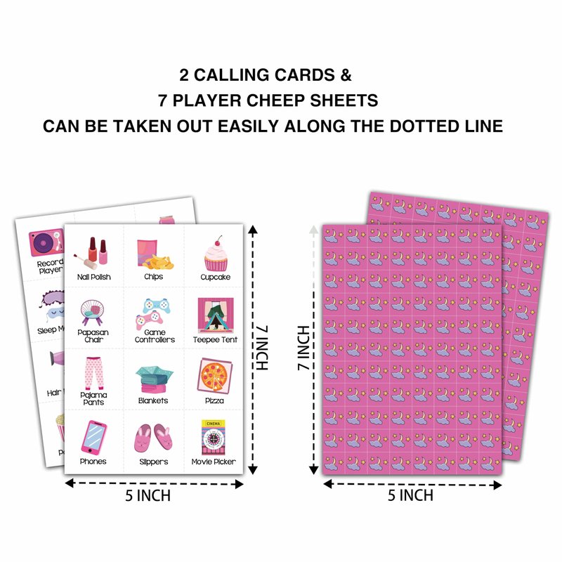 【GAMES FOR PARTY PACKAGE】Sleepover bingo game includes 24 unique bingo player cards(24 different patterns per card), 7 marking chips(12pcs chips per card), and 2 calling chips.