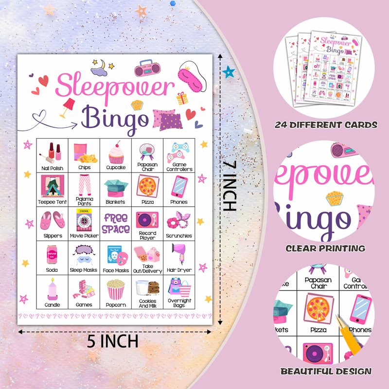 - 【GAMES FOR PARTY PACKAGE】Sleepover bingo game includes 24 unique bingo player cards(24 different patterns per card), 7 marking chips(12pcs chips per card), and 2 calling chips.