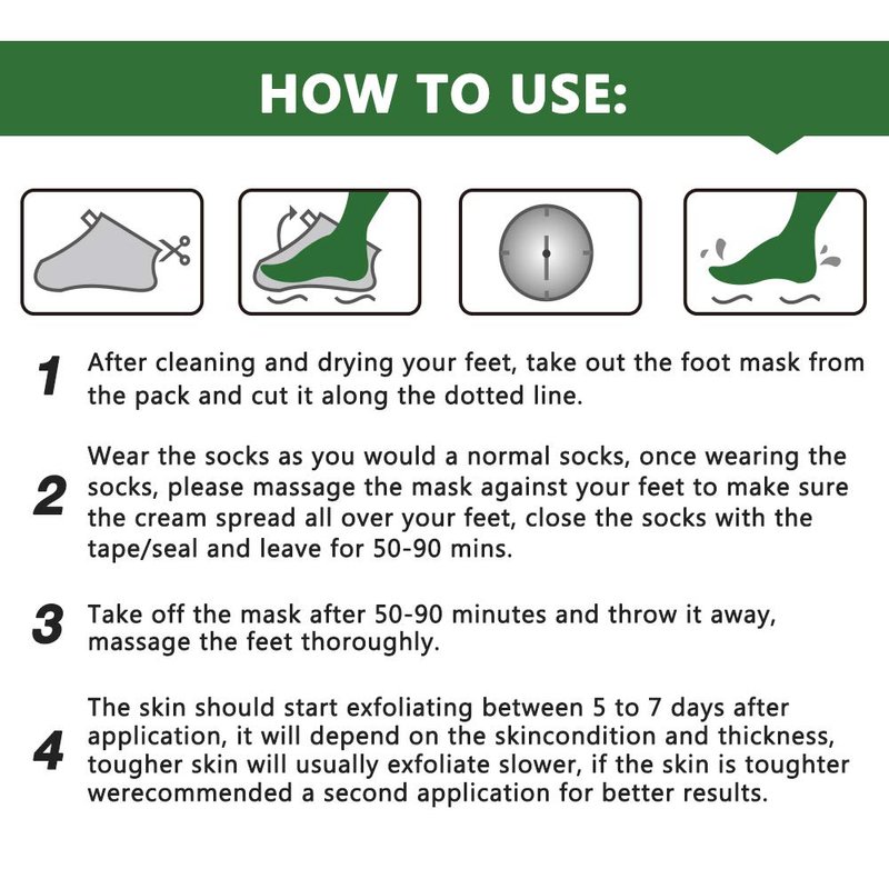 - Baby Soft Skin: Wear foot peel mask on your feet for 50-90 minutes and then remove it. The dead skin on the feet will fall off and the skin so soft like baby foot peel