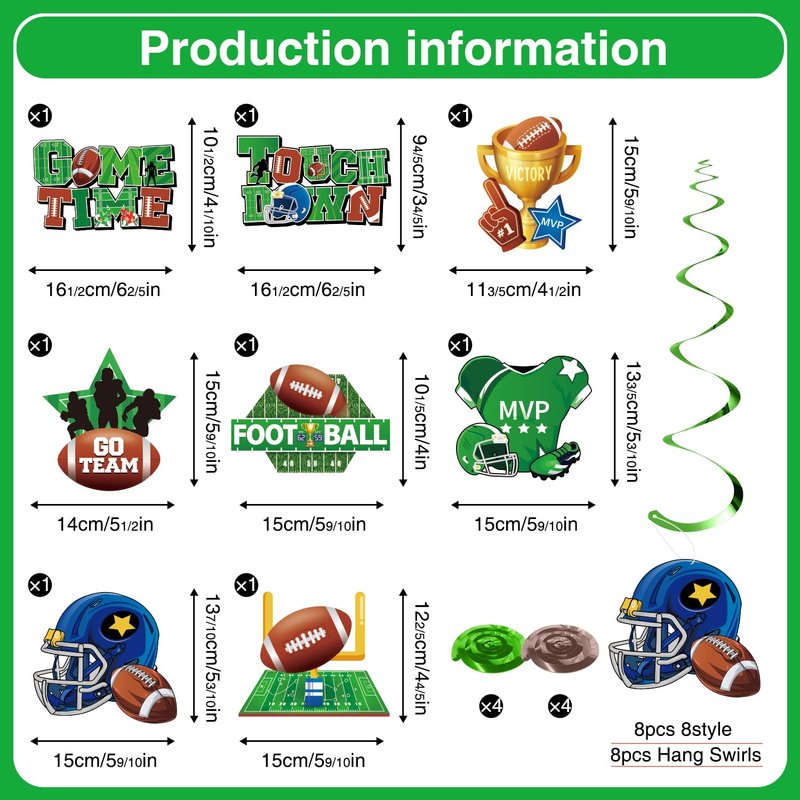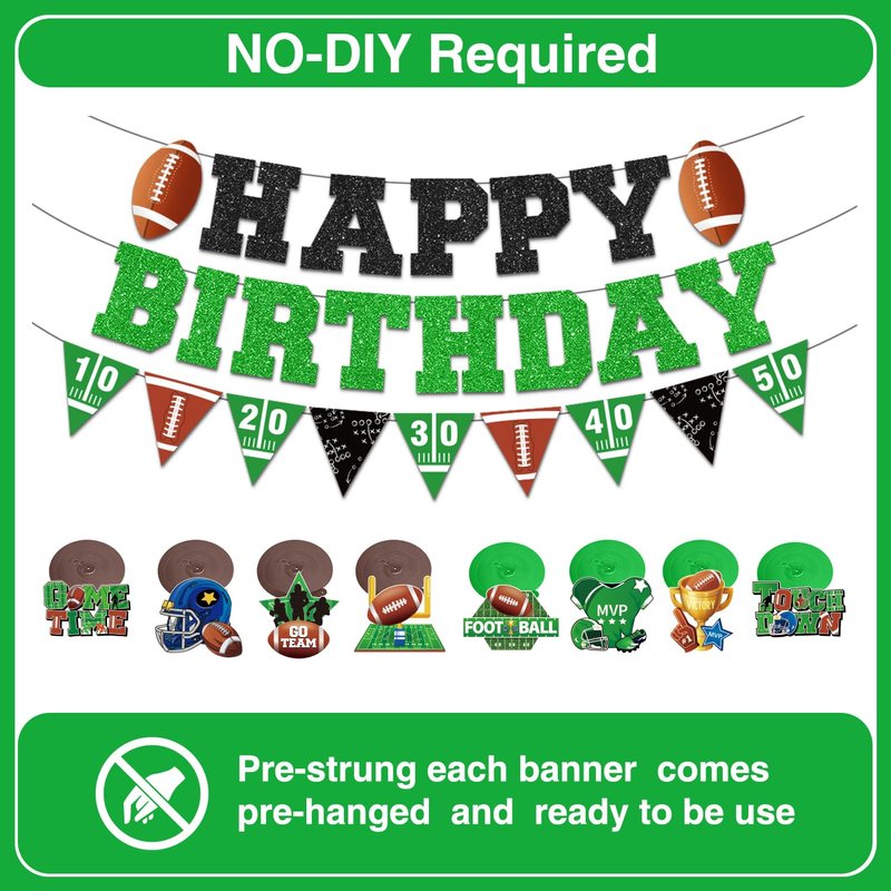 - package included: the football party decorations include 1 pc glittery happy birthday football banner, 1 pc football themed party decorations garland banner, 8pcs birthday decor hanging swirls, and 7pcs paper pom poms. and the color scheme of our football themed party supplies feature green, brown and black