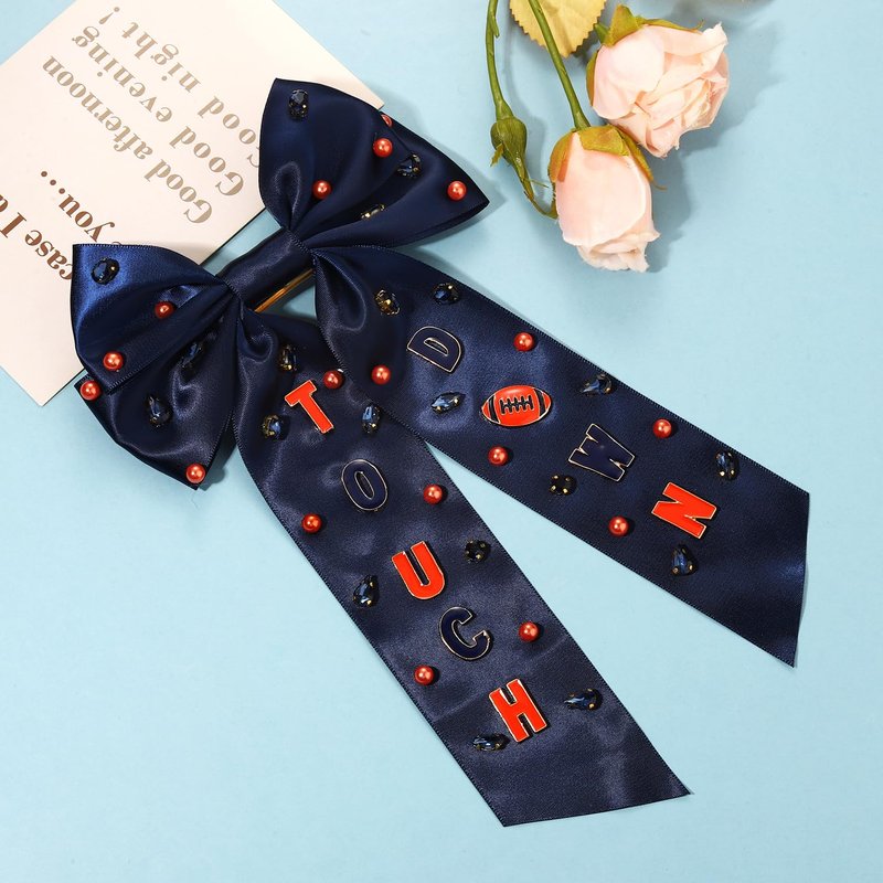 - ✔Football Hair Bows: Make a statement while supporting your team with our football hair accessory, in honor of your player, make your personal style a grand slam!! Feature a delicate large ribbon bow adorn with cute football charms and gorgeous crystals, attached to sturdy gold barrette, that add a playful touch to your game day ensemble. Whether you're cheering from the sidelines or leading the halftime dance, these football hair bow clips will have you sparkling like the true star you are!