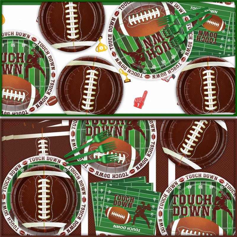 - Package Includes: The football decorations include 40 x football dinner plates, 40 x football dessert plates, 40 x football party napkins, 2 x brown football tablecloths, 2 x green football theme tablecloths, and 40 x forks.