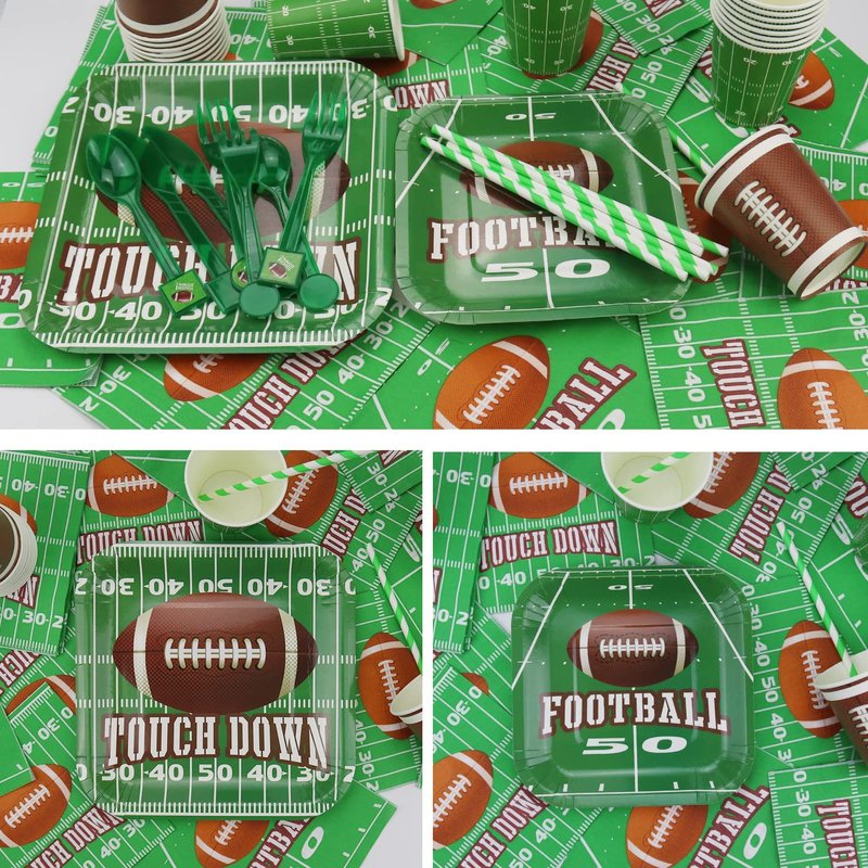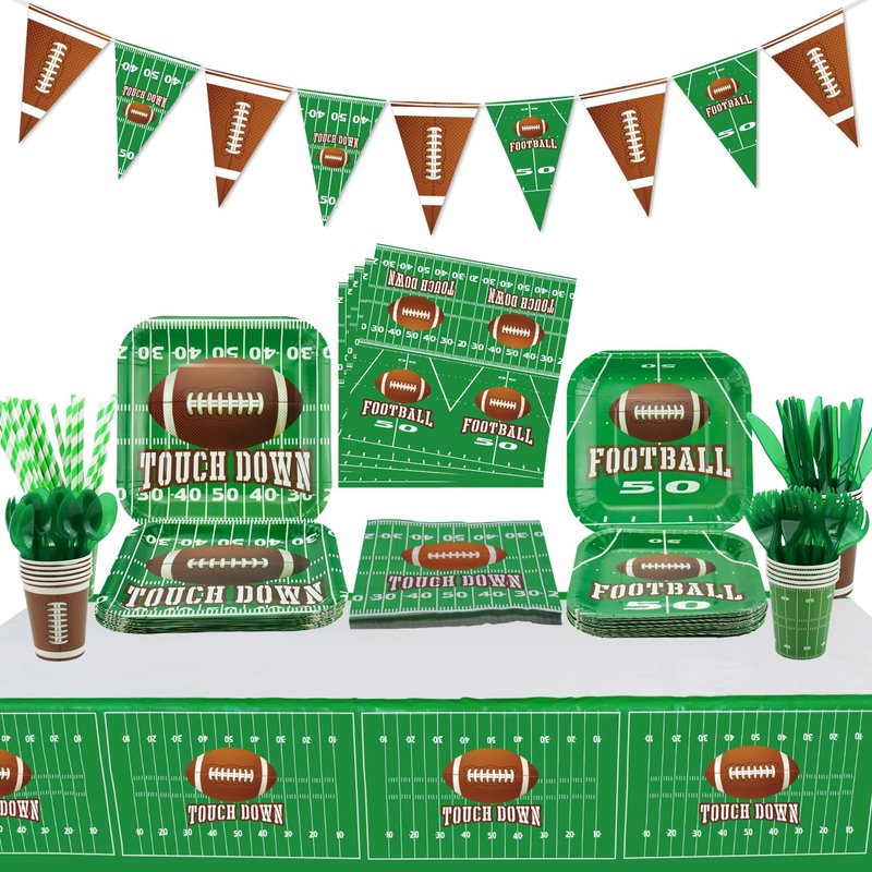 - VALUE PACKAGE - Football theme party decorations set. Include football plate x20, football cups x20, football napkins x20, football tableware x20, football tablecloth x1.