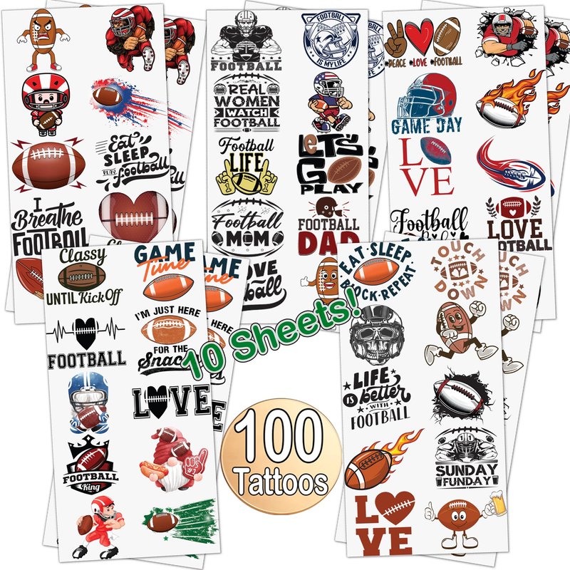 - Party Pack | Included in your purchase are 10 sheets, each sheet containing 10 tattoos, that’s 100 total tattoos included! Plenty to pass around to all your guests so they too can join in the fun. A sure way to bring game day excitement to all football celebrations.