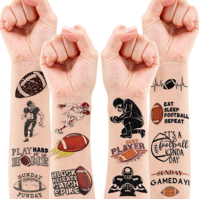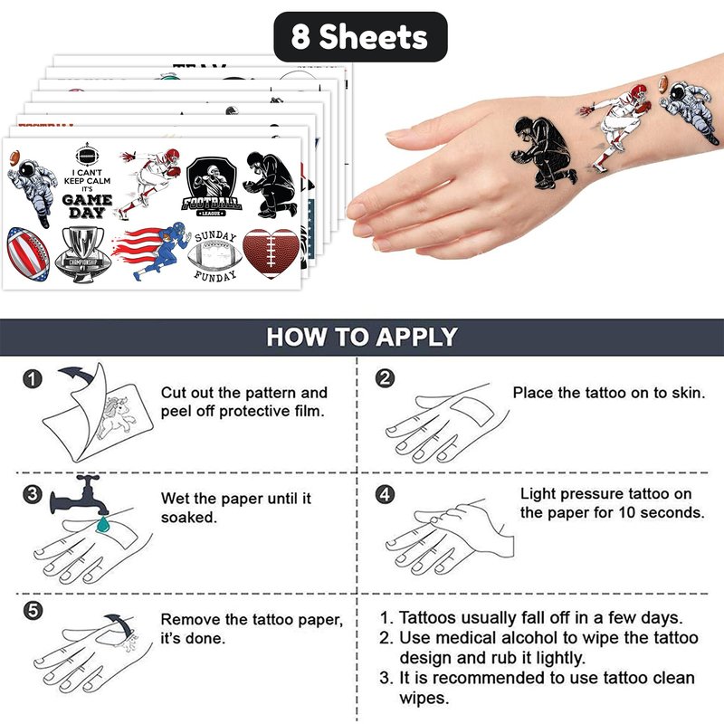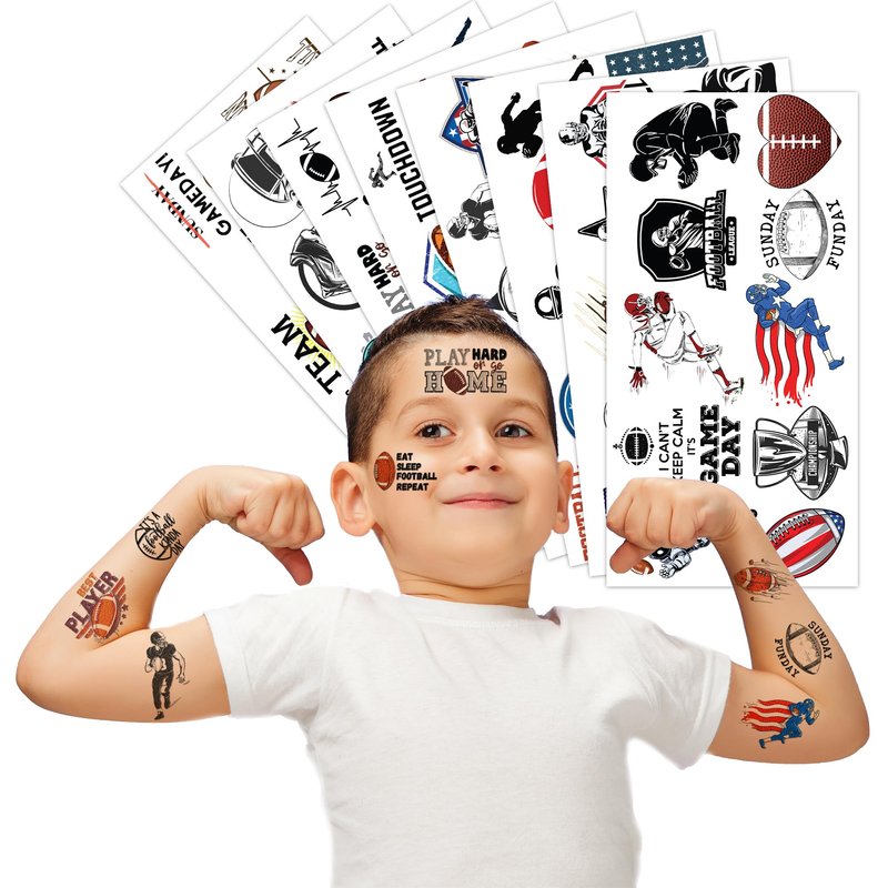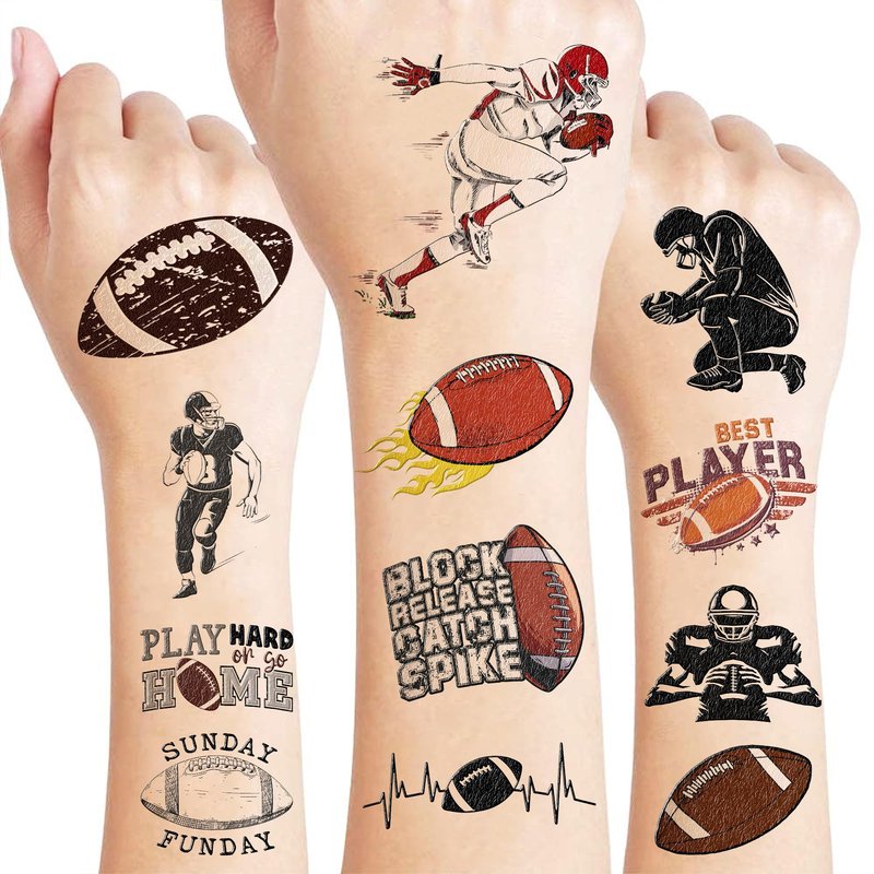 🏈【PERFECT TATTOOS FOR THEMED FOOTBALL DECORATIONS】: FOOTBALL temporary tattoo stickers include 8 sheets in total. There are 81 Pcs super cute tattoo differences. Perfect for giving out party favors and holiday theme small gifts. The size of each sheet is 6.1 * 3.1 inches. One size fits kids. 🎁【GREAT GIFT IDEAS FOR FOOTBALL PARTY SUPPLIES AND DECORATIONS】: You will receive many compliments when you decorate your child's birthday party with a FOOTBALL, Sport Game Player Summer Olympic theme. FOOTBALL tattoos are a small gift you should not pass up for your kids. 🌍【SAFE AND ENVIRONMENTALLY CONSCIOUS】: Our temporary tattoos are made from materials that are safe and prioritize sustainability. These tattoos are created using paper that is both safe for users and friendly to the environment. 🥳【ADD A TOUCH OF FUN】: Are you tired of mundane gifts? We've got you covered! Our collection of adorable and vibrant temporary tattoo designs can be applied to laptops, backpacks, desks, suitcases, books, water cups, and more. These playful elements will surely elevate your visual experience and bring a touch of joy to everyday items. 🌴【EASY TO USE AND REMOVE】: Cut each tattoo out of sheets and remove the sheet clearly. You can stick it on your hands, face, arms or wherever you feel safe. Moreover, you put it down on glasses, clothes, and a smooth flat . After that, you wet it thoroughly with water and wait for 20-30 seconds, you get rid of the backing paper. As a result, you have a velvety tattoo as we say. 👍【PERFECT SERVICE】: If you have difficulty using our product, contact us. We will make sure to solve problems and help you have a wonderful buying experience. 🙉【 Not recommended for people with a history of sensitive skin, if symptoms appear, stop using immediately】