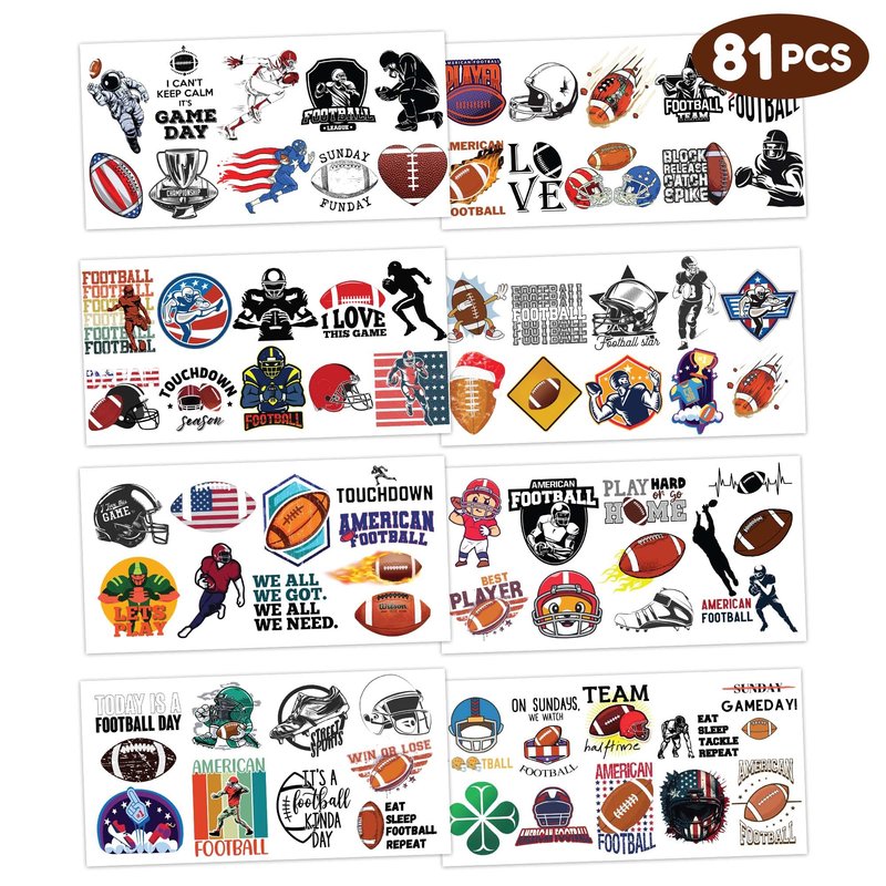 - 🏈【PERFECT TATTOOS FOR THEMED FOOTBALL DECORATIONS】: FOOTBALL temporary tattoo stickers include 8 sheets in total. There are 96 Pcs super cute tattoo differences. Perfect for giving out party favors and holiday theme small gifts. The size of each sheet is 6.1 * 3.1 inches. One size fits kids.