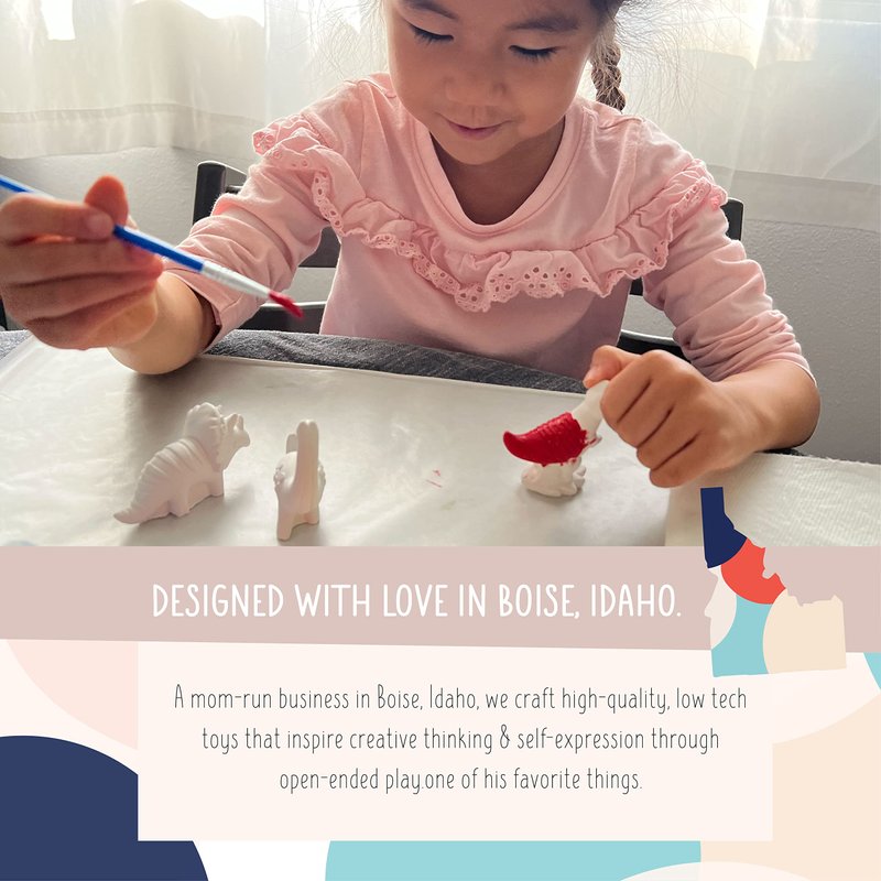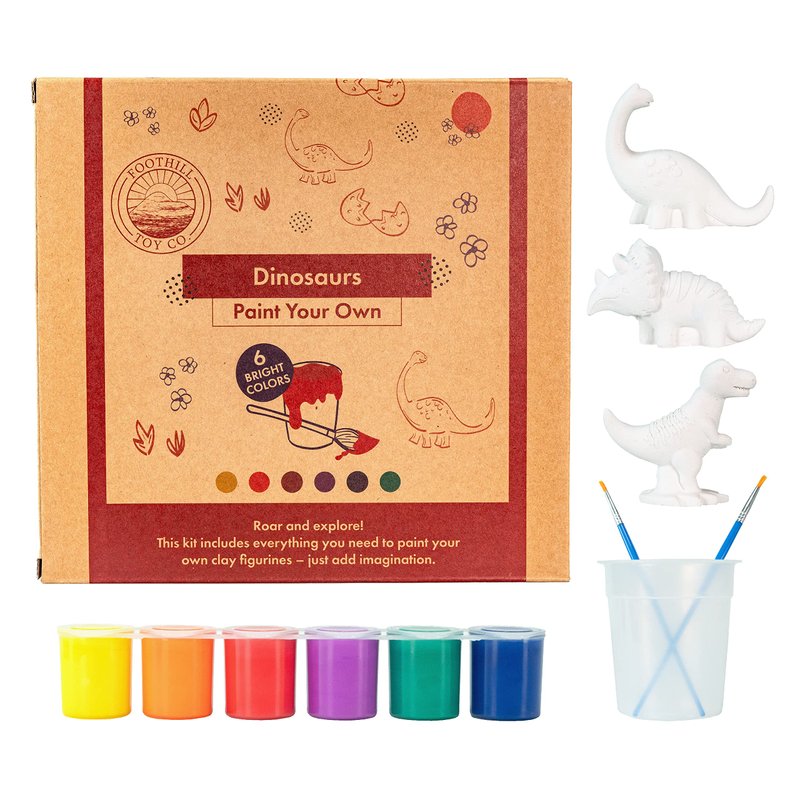Roar and explore! This kit includes everything you need to paint your own clay figurines - just add imagination. Designed by a mom of three in the "little big city" of Boise, Idaho. Foothill Toy Co. creates interactive playthings that parents trust and kids adore. Our DIY Paint Sets inspire creative-thinking and promote self-expression.