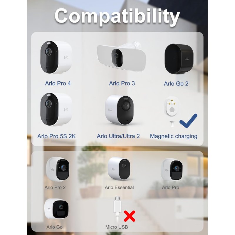 Arlo Pro 4, Pro 3 Ultra, Ultra2, Go 2 Floodlight. Not compatible:Arlo Pro 2, Arlo Pro, Arlo Go, Arlo Security Light and Arlo Basic Camera.