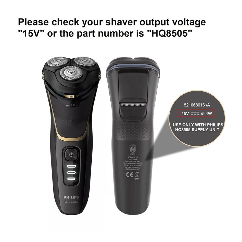 - Philips Norelco Charger Cord: Input: 100-240V AC, 50-60Hz. Output: 15V 500mA /5.4W, Perfect Substitute the Original HQ8505 Charger, the charging speed is not lower than the original charger.