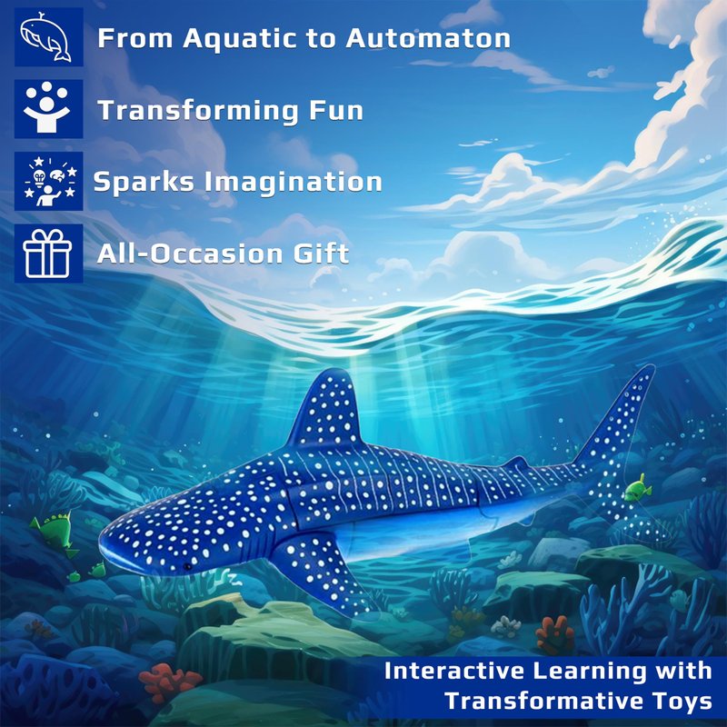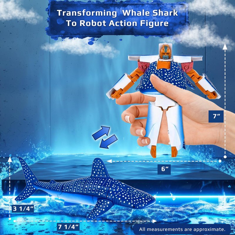 - TRANSFORMING WHALE SHARK – Watch your child’s eye widen in amazement as they discover the hidden secrets this 4" whale shark sea animal toy holds. By moving its pieces around, it transforms into a fully articulate and powerful robot toy.