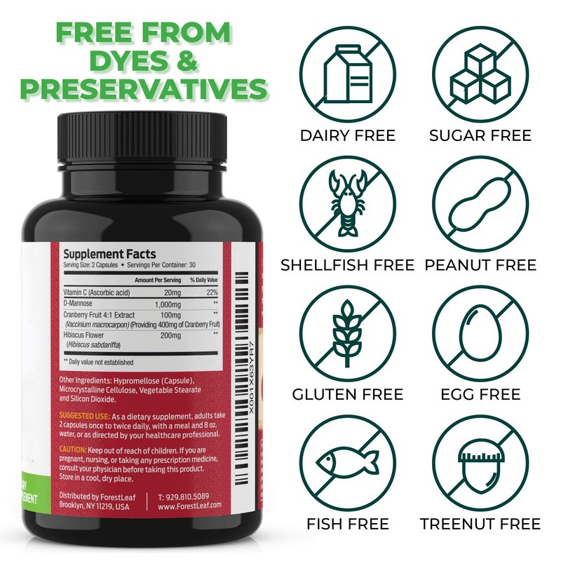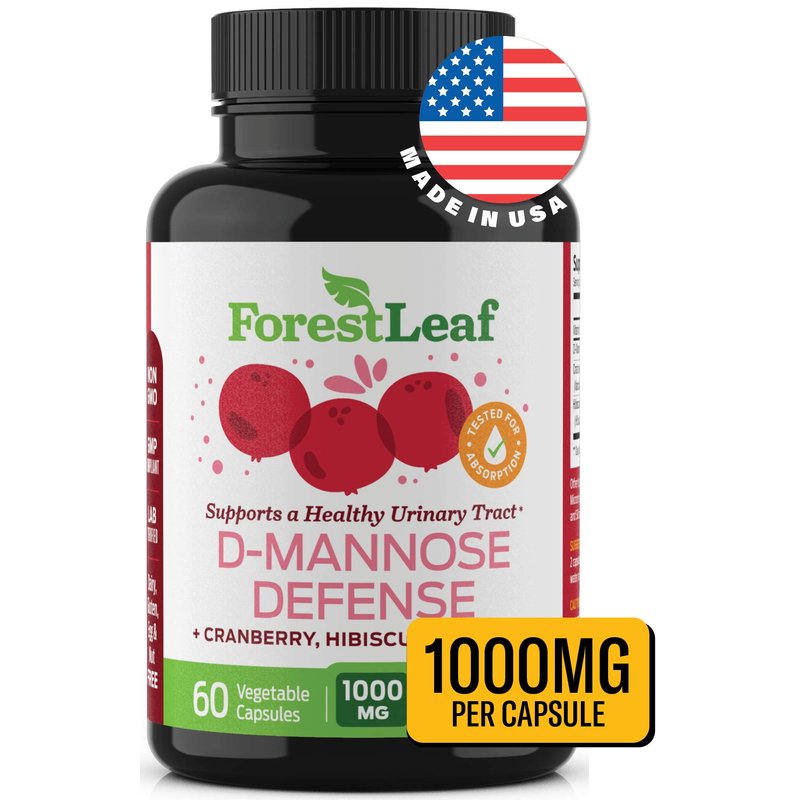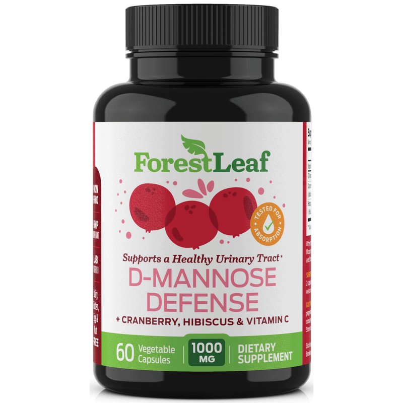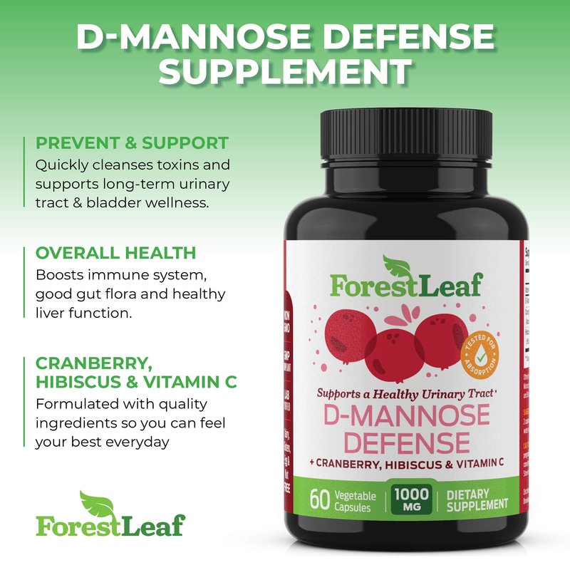 - SUPPORTS A HEALTHY URINARY TRACT - ForestLeaf D-Mannose Defense combines the herbal and flower extracts of cranberry and hibiscus along with Vitamin C into potent D-mannose 1000mg capsules and may provide relief to urinary tract symptoms such as pain, bloating, urge to pee, and excessive urination.