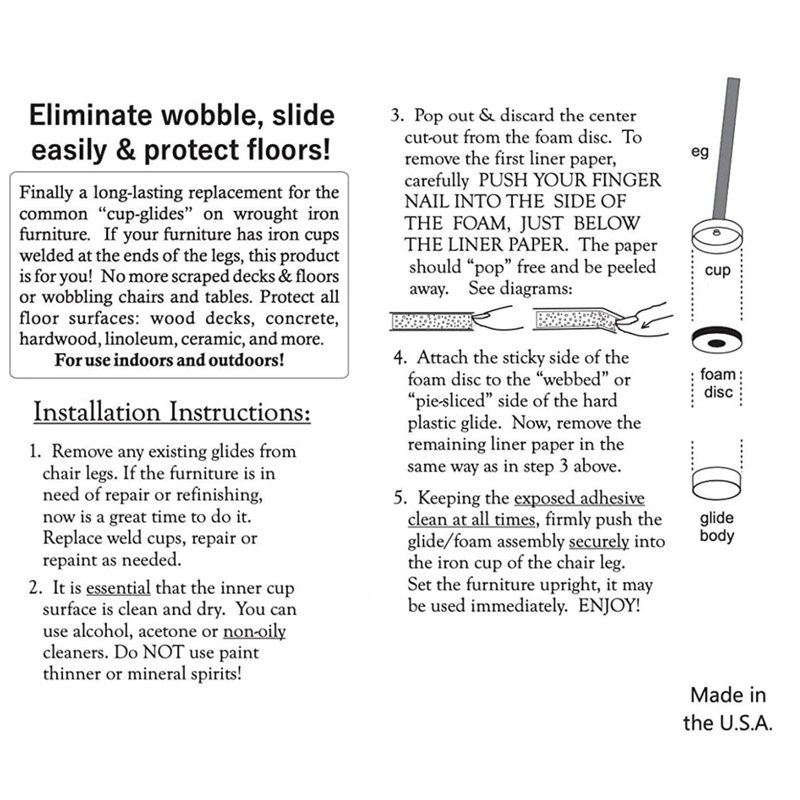 Forever Glides are revolutionary self-leveling replacement feet for wrought iron furniture. The replacement feet replace those missing plastic pop-in furniture inserts with glides that stay in place. Missing table and chair feet inserts can cause damage and scrapes to your surface. Forever Glides protects all your floor surfaces! Replace your old-fashioned pressure fit cup inserts with new high-grade Delrin material glides made for durability and last up to 10 times longer than conventional glides. Forever Glides are made in the USA.
