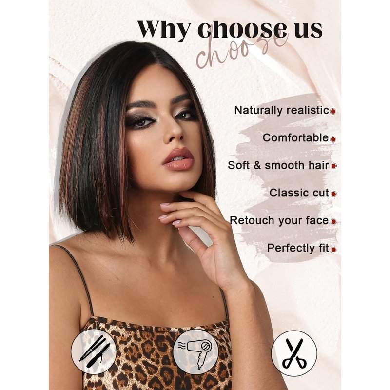 Product Name: 10 Inch Synthetic Side Part Bob Wig for Black Women Product Description: Length: 10 inches Color: Brown Highlight Material: high temperature silk synthetic fiber Wig cap type: Classic breathable mesh wig cap, comfortable to wear for long periods. Partial design: Natural parting, increasing layering and three-dimensionality Heat resistance: heat-resistant to 180 degrees Celsius, can be styled with low-temperature curling irons and hair straighteners Maintenance suggestions: Use a special comb for wigs and avoid high-temperature perms.