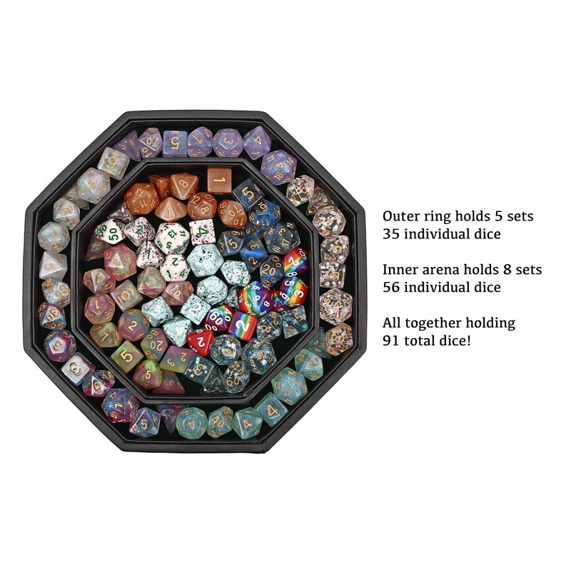 - Dual purpose rolling tray and storage. Holds up to 125 standard polyhedral dice. Lid comes off and can be used as another rolling tray.