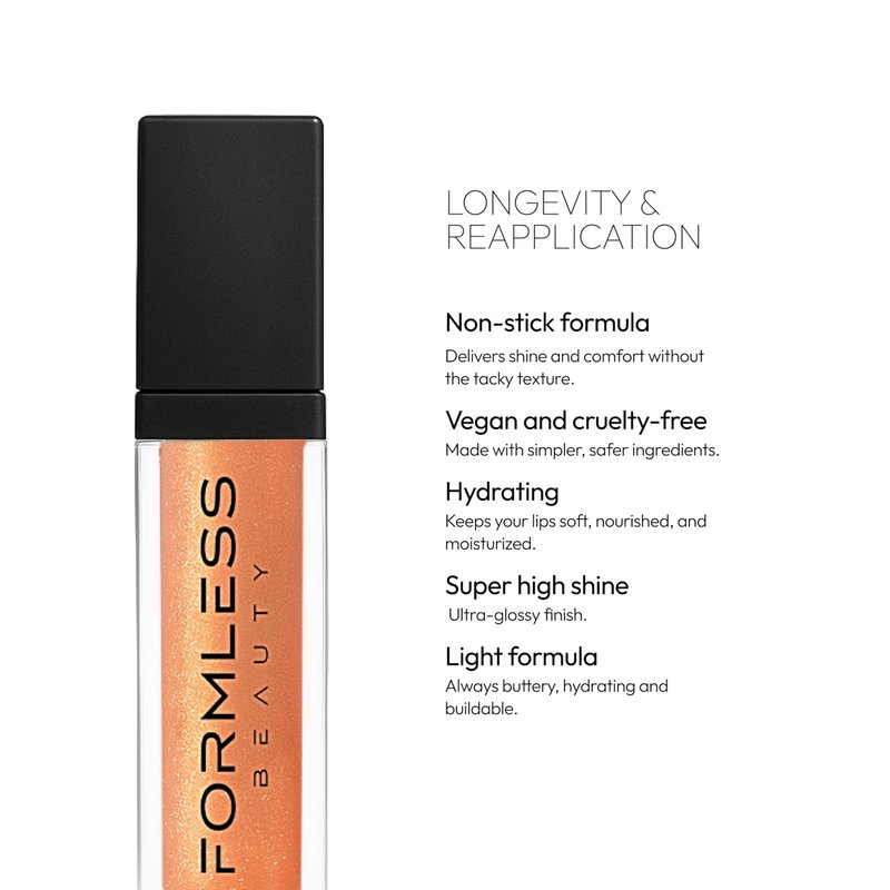 Formless Beauty | Majestic Peach Lip Gloss by Jenny McCarthy | Peach Gloss Infused with Gold Glitter | Vegan Hydrating Formula | Non-Sticky Aloe & Jojoba Infused | Paraben&Cruelty Free | Lip Enhancer